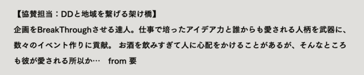 Dramati Diningでは、50名ほどのメンバーで運営、制作をしています。 バッググランドは多岐にわたり、仕事でありなしにかかわらず、それぞれのスキルや長所を最大限発揮し、 プロジェクトの成功と共に、何か自己実現もできるように切磋琢磨しています。 幅広い分野で活躍する面々を、 メンバー同士で他己紹介をしてもらいました!