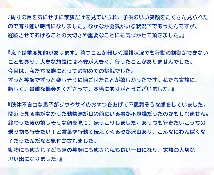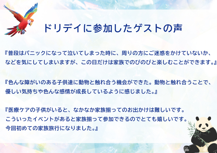 ドリデイは障がいのあるお子様とそのご家族にとって、これまで挑戦のハードルを高く感じてしまっていた旅行や、大勢人のいる場所へのお出かけ、動物とのふれあい、遊園地の乗り物にに乗る、など様々なことに挑戦するきっかけとなるイベントです。