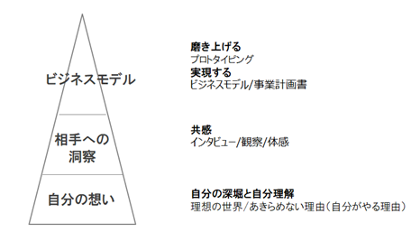 新規事業を立上げる。おそらく、いろいろな考え方があると思います。例えば、マーケットや競合、自社の資源などから考える方法や、デザインシンキングに代表されるような『顧客の体験』から考えはじめる方法などです。ドリプラ信州では、「自分が本当にやりたいことは何か?」「自分が得意なことは何か?」「自分が好きなことは何か?」から考えはじめました。“自分”が土台にあり、そのうえに“顧客”があり、そのうえにビジネスモデルを論理的に考えるというピラミッド構造のイメージです。