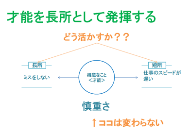 例えば、“慎重さ”という特性を持ったひとがいたとします。その特性はある角度から見ると“仕事のスピードが遅い”という短所に見えます。一方で、別の角度から見ると、“ミスをしない”という長所にもなります。“慎重さ”という特性を変えることはできません。それをどう活かすかです。