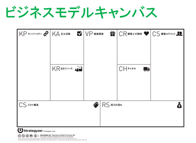 今回は、ビジネスモデルキャンバスを使いました。ガイドにしたがって、マスを埋めていくだけで、自分らしいビジネスモデルの完成です。
