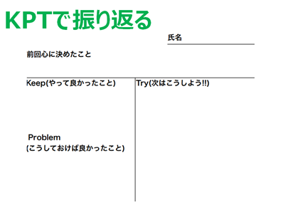 アクションをしたあとは、そのアクションについて振返りをします。振返りにはKPTという手法を使いました。