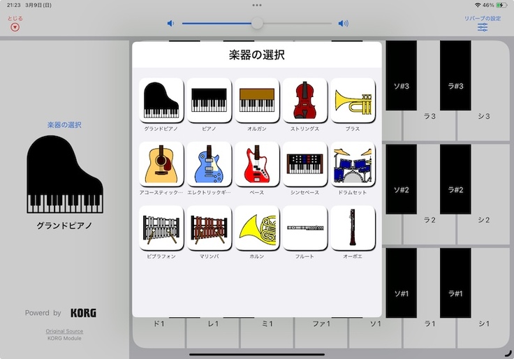 【KORG社から提供いただいた15種類の楽器音を内蔵しています。どれもリアルな使える音ばかりです】