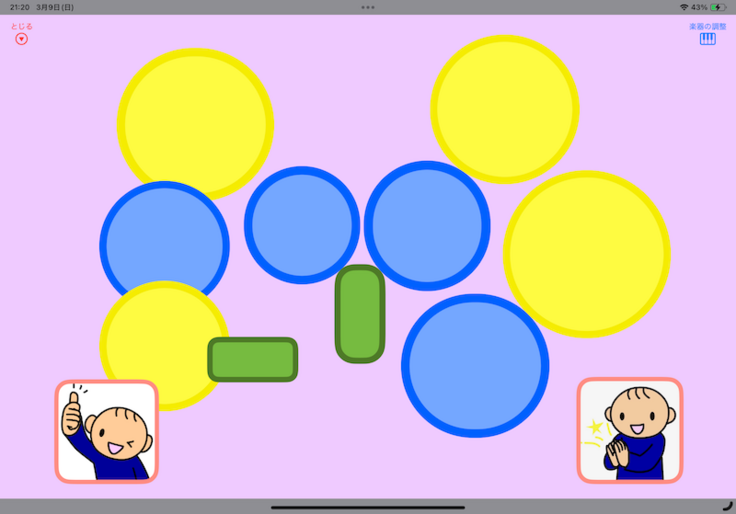 画面のタッチと外部スイッチを同時に使って演奏することもできますので、1台のiPadで、複数の子が自分にあった方法で合奏することもできるのです。