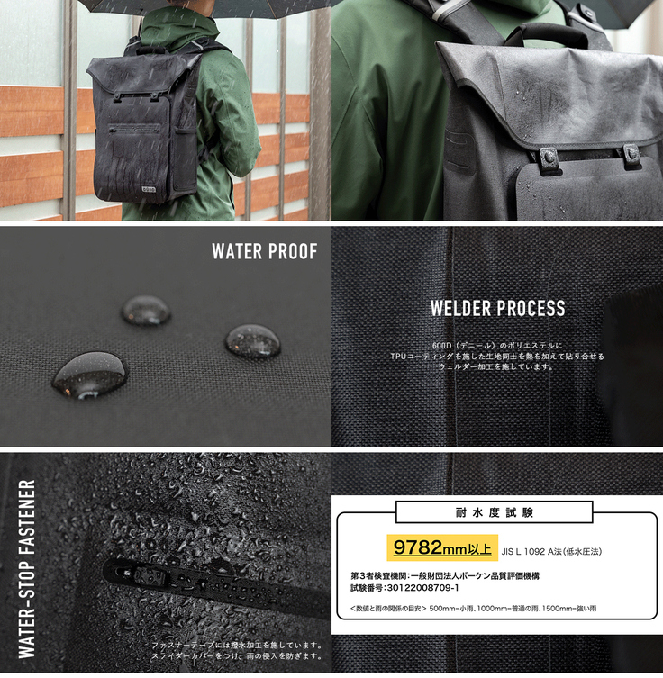 急な雨でも安心の耐水性。 タフな素材と止水ジッパーを採用し、荷物をしっかり守ります。