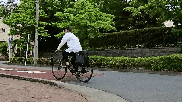 朝、自転車で颯爽と通勤。 バッグはパニアスタイルで快適な走り心地。