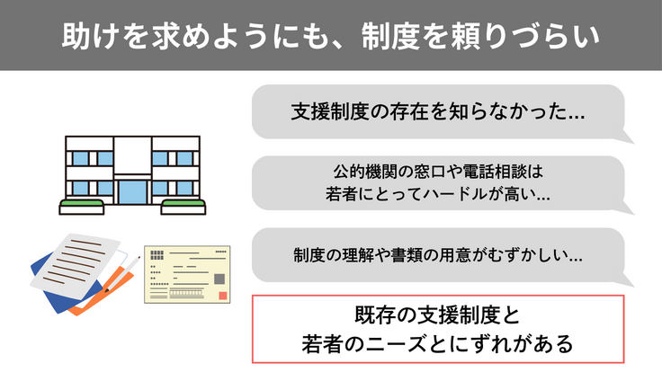 行政側も若者に支援を届けるために奮闘しています。しかし、支援制度そのものを若者が知らなかったり、若者が公的機関へ相談すること自体ハードルが高かったり、制度の理解や書類の整理が難しかったりするなど、制度と若者側のニーズとの間にギャップがあるのも事実です。結果的に若者が制度につながらないことがあります。