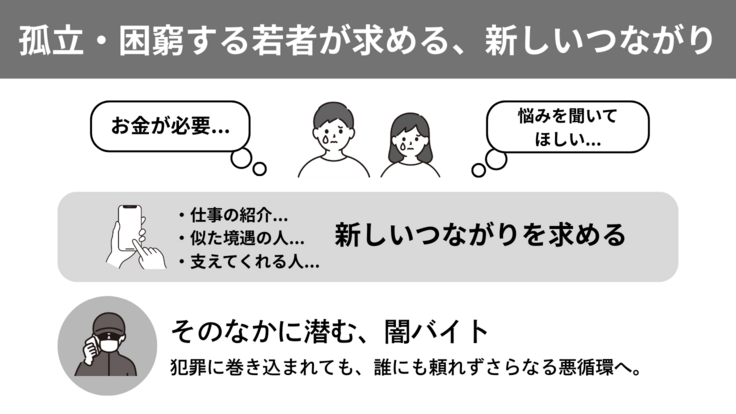 こうして、若者たちはさらに困窮と孤立を深めていきます。明日のご飯を食べるために、お金がほしい、誰かに話を聞いてほしい。藁にもすがる思いで、若者たちは新たなつながりを求めます。