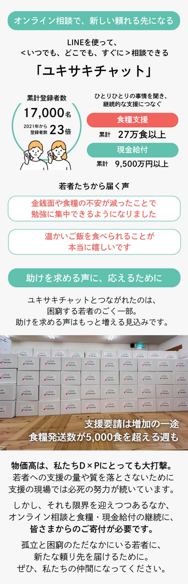 上記の食糧支援・現金給付は、ユキサキチャットで出会った若者の中で、特に厳しい状況の若者に届けるサポートです。
