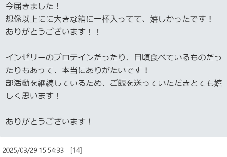 最近届いた「部活動を続けているので、ご飯を送っていただき嬉しいです」というメッセージ。