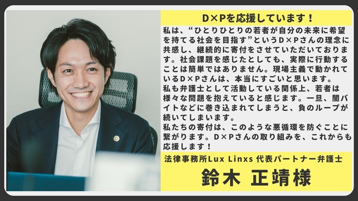 私は、“ひとりひとりの若者が自分の未来に希望を持てる社会を目指す”というD×Pさんの理念に共感し、継続的に寄付をさせていただいております。社会課題を感じたとしても、実際に行動することは簡単ではありません。現場主義で動かれているD×Pさんは、本当にすごいと思います。