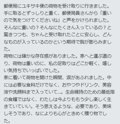郵便局で食糧支援の箱を受け取ったとき「重いので気をつけて」と声をかけられたそうです。