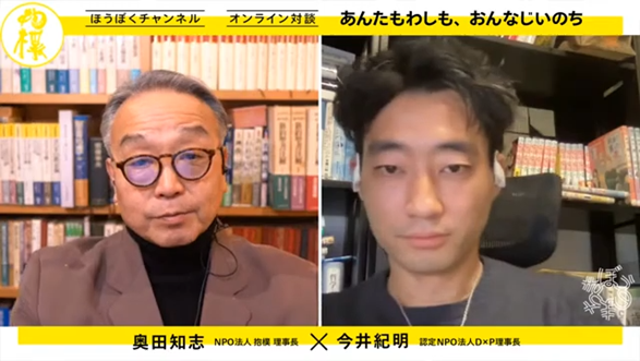 先日、D×P理事長の今井が、YouTube「ほうぼくチャンネル」のオンライン対談「あんたもわしも、おんなじいのち」にゲスト出演いたしました。