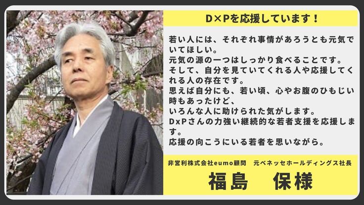 非営利株式会社eumo顧問 元ベネッセホールディングス社長 福島 保様から応援メッセージが届きました。ありがとうございます!