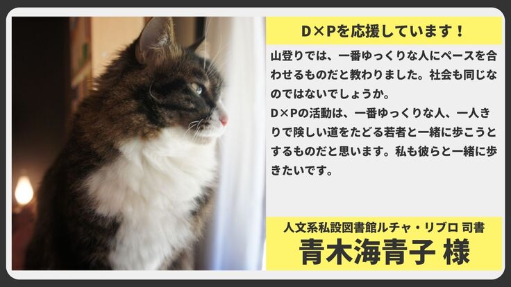 山登りでは、一番ゆっくりな人にペースを合わせるものだと教わりました。社会も同じなのではないでしょうか。D×Pの活動は、一番ゆっくりな人、一人きりで険しい道をたどる若者と一緒に歩こうとするものだと思います。私も彼らと一緒に歩きたいです。