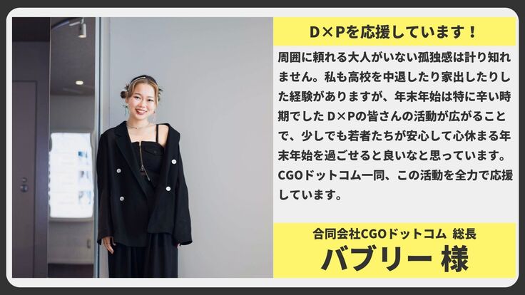 周囲に頼れる大人がいない孤独感は計り知れません😭 私も高校を中退したり家出したりした経験がありますが、年末年始は特に辛い時期でした💦💦 D×Pの皆さんの活動が広がることで、少しでも若者たちが安心して心休まる年末年始を過ごせると良いなと思っています🌈 CGOドットコム一同、この活動を全力で応援しています📣✨