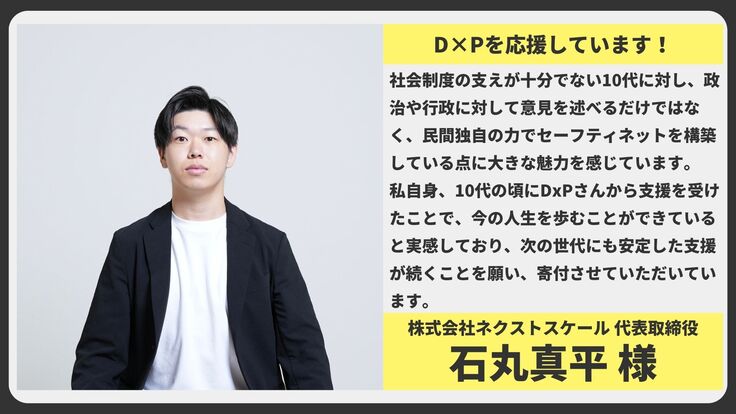 私自身、10代の頃にDxPさんから支援を受けたことで、今の人生を歩むことができていると実感しており、次の世代にも安定した支援が続くことを願い、寄付させていただいています。