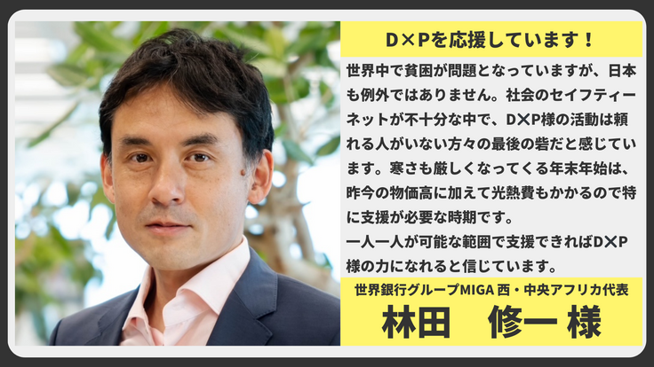 世界中で貧困が問題となっていますが、日本も例外ではありません。社会のセイフティーネットが不十分な中で、D×P様の活動は頼れる人がいない方々の最後の砦だと感じています。寒さも厳しくなってくる年末年始は、昨今の物価高に加えて光熱費もかかるので特に支援が必要な時期です。一人一人が可能な範囲で支援できればD×P様の力になれると信じています。