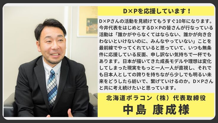 D×Pさんの活動を見続けてもうすぐ10年になります。今井代表をはじめとするD×Pの皆さんが行なっている活動は「誰かがやらなくてはならない、誰かが向き合わないといけないのに、みんなやっていない」ことを最前線でやってくれていると思っていて、いつも無条件に応援している反面、申し訳ない気持ちで一杯でもあります。日本が描いてきた成長モデルや理想は変化してしまった現実をもっと一人一人が直視し、それでも日本人としての誇りを持ちながら少しでも明るい未来をどうしたら紡いで、繋げていけるのか。D×Pさんと共に考え続けたいと思っています。
