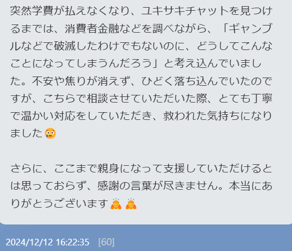 先日、学費が払えなくなり、不安の中でユキサキチャットにたどり着いた若者から、こんなメッセージをいただきました。