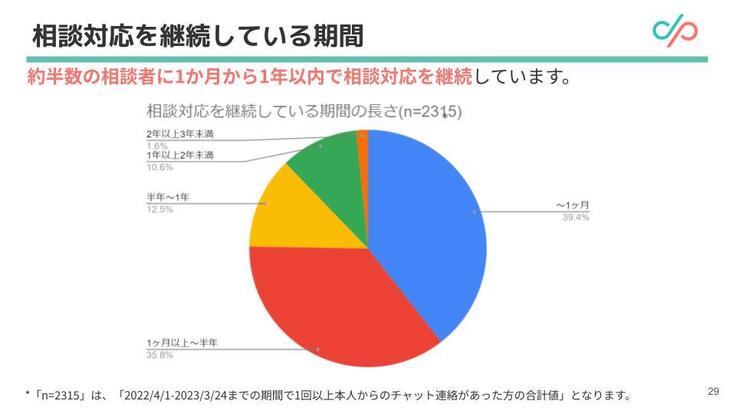 実際に、約半数の相談者に1ヶ月から1年以内で相談対応を継続しています。