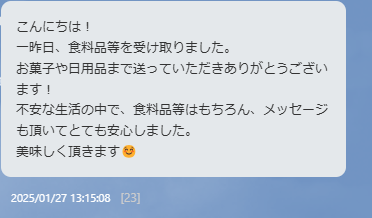 「不安な生活の中で、食料品等はもちろん、メッセージも頂いてとても安心しました。」