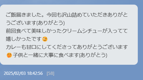 「ご飯届きました。今回も沢山詰めていただきありがとうございます」