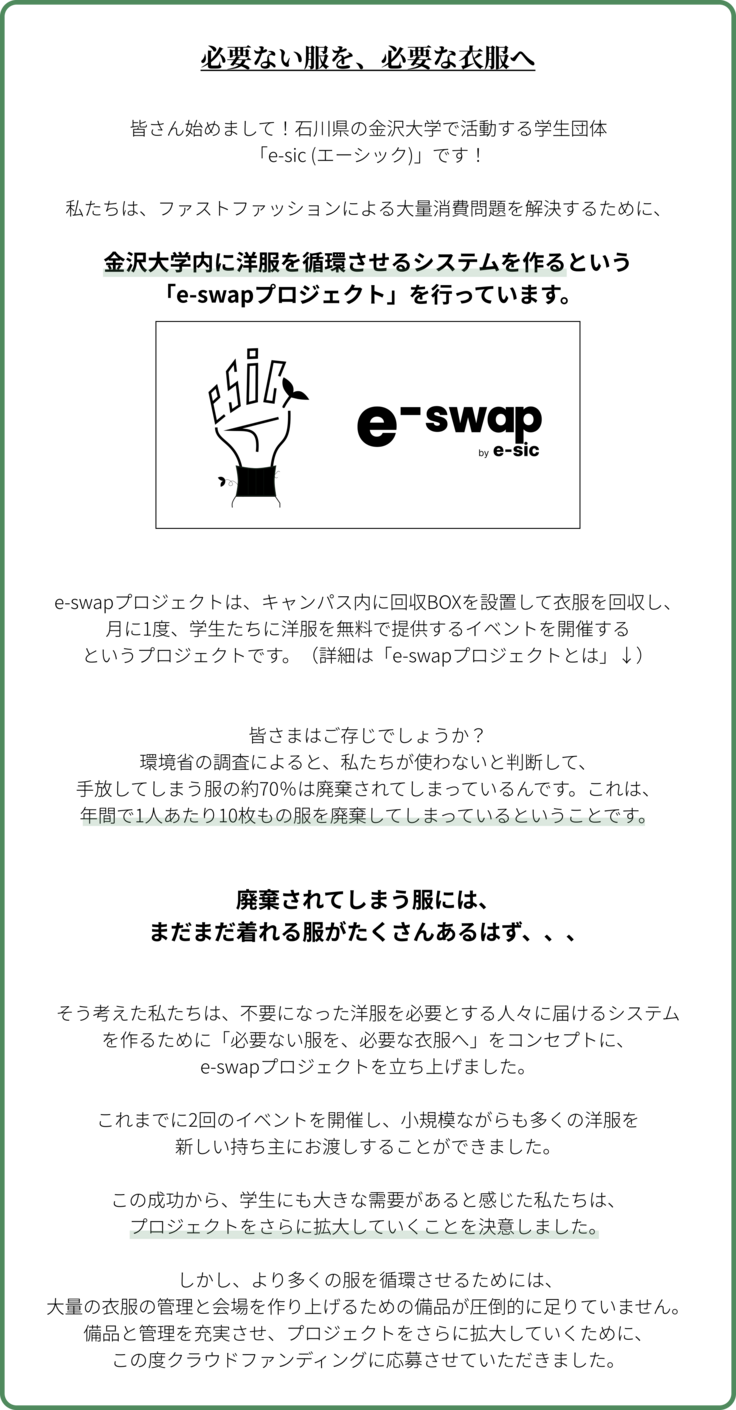 e-swapプロジェクトとは、主に金沢大学内の大ホールや小スペースで開催される、回収した洋服を必要としている人にお渡しするイベントです。