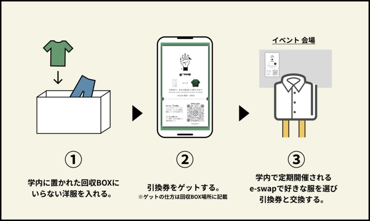 このイベントは、事前に大学内に設置された回収ボックスに衣服を寄付しただき、服1着につき1枚の引換券を受け取っていただくことで成り立っています。