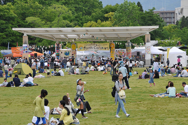 アースキャラバンのマーケットは、純益100%チャリティー。ここで食事や買い物をすることがそのまま寄付となります。会場ではたくさんの人が子どもの心になって、歌ったり踊ったり遊んだり、自由でハッピーな世界を分かち合いました。