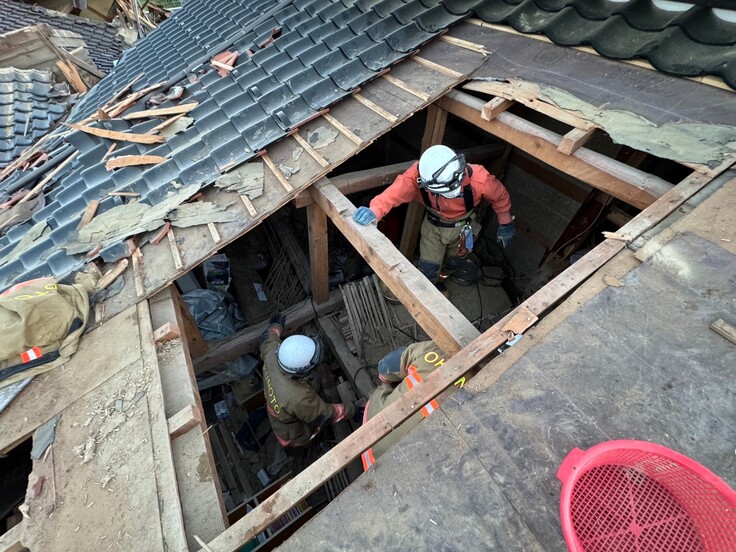 黄が駆けつけたところ、倒れた家屋の柱や家具の隙間に挟まれ、動けなくなっていた71歳の方が見つかりました。声をかけたところ、まだ声を出すことができ、しっかりと息をされていました。