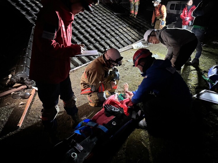 チームは地元の消防チームの皆さんと連携して、柱や家具などのさらなる倒壊に注意しながら女性を救出。2階の窓から担架で女性を外へ出して容体を確認しました。その後、車で数分のところにある指揮所にて、ARROWS医療チームの医師が診察し、病院へ搬送しました。