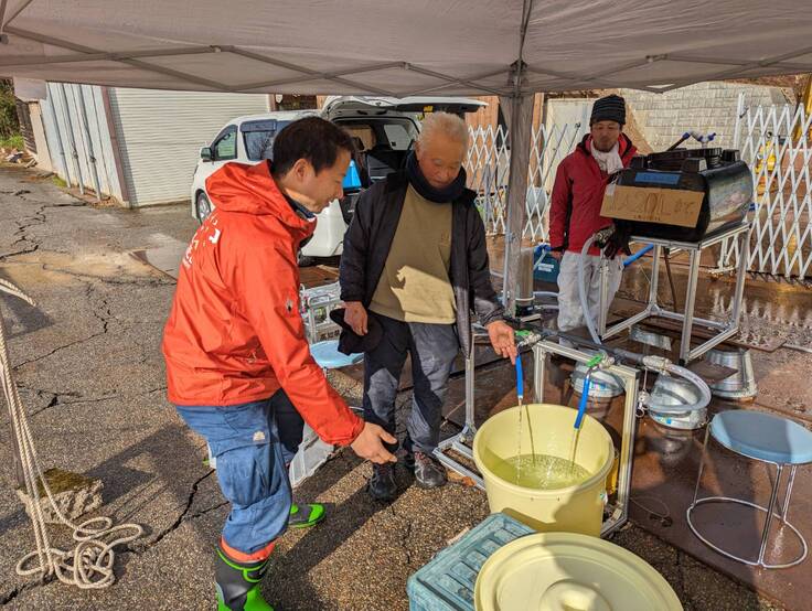 私たちは、4日から市内の避難所に浄水設備を設置し、近くにあるダムの水などを浄水。逆浸透膜浄水装置の製造・販売を行うアクアデザインシステムさんと協力し、避難をしている人の飲み水や生活用水として活用されています。6日からは1つの避難所だけなく、周辺の複数の避難所や在宅避難をされている方々も使えるよう、各避難所などをまわって浄水場設置について呼びかけました。