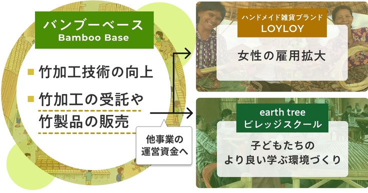バンブーベースを稼働させることで雇用や販売できる商品を生み出し、運営資金を集めることができます。生み出した資金は下記の活動に繋がっていきます。