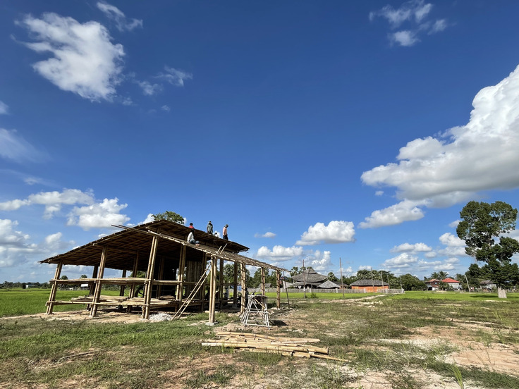 3月にクラファンが終わり、5月に着金して、土地の購入、土入れ、バンブーベースまでの道作り、電柱を立てて、電線を引き、メーターをつけてもらって、日陰を作り、竹を運んで、土台を作り、竹を組んで、屋根を貼って一つ目の建物完成しました!