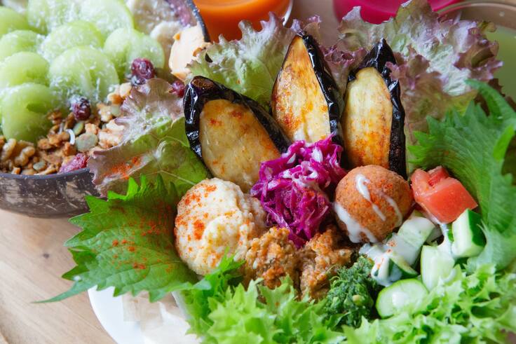 ▷(左)ヴィーガンカフェのファラフェルサンドとアサイーボウル