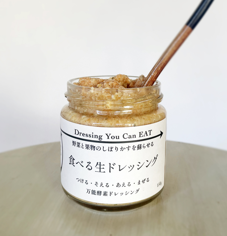 「食べる生ドレッシング」は、ローフードマイスター&アーユルヴェーダアドバイザーであるeat YOGA STUDIOオーナーMikkoが約5年前に開発した商品です。スロージュースの製造過程で大量に出るパルプ(絞りカス)をリユースする方法を模索したなかで生まれたのがこの『食べる生ドレッシング』。味の美味しさはもちろんのこと、その食感や使用方法、栄養価、全てにおいて想像を超える逸品です!!