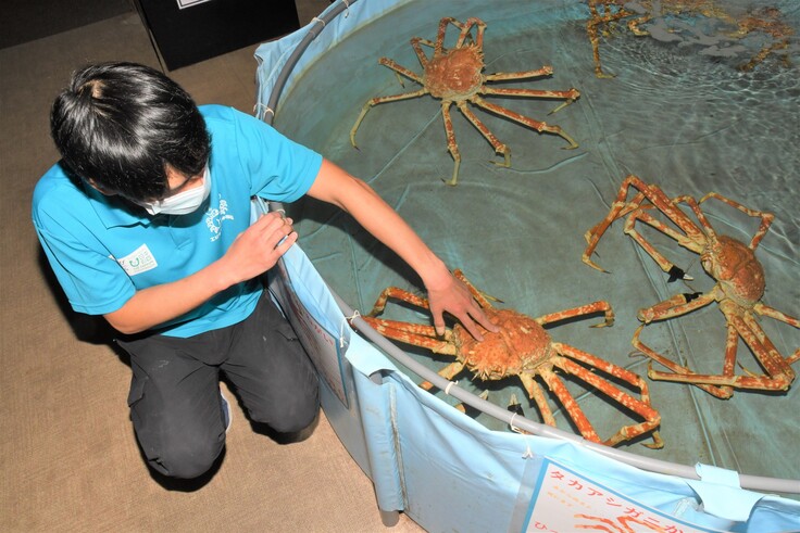 また、当館の魅力はそれだけではありません。世界最大のカニといわれる「タカアシガニ」や深海ブームで大人気となった「オオグソクムシ」、生きた化石と呼ばれる「アメリカカブトガニ」などと触れ合えるエリアもあり、生き物をかなり近い距離で見て、触れていただくことができます!