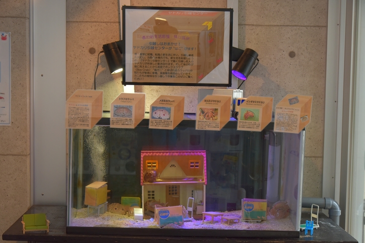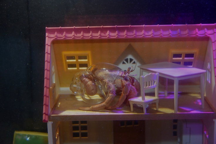 今回は、家の模型と家具の模型が配置された水槽内で自由に動き回るヤドカリたちと、箱のように動かないカラッパの仲間たちのシュールな特別展示水槽となりました。