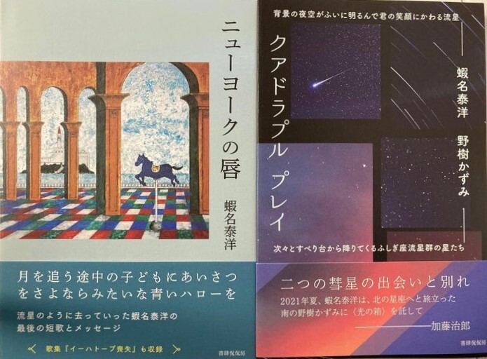 蝦名さん自身が、末期がんの痛みと闘いながら、「ニューヨークの唇」180首をまとめ終えたのは、亡くなる1か月前でした。ほかに生前唯一の歌集『イーハトーブ喪失』(1993年)、野樹との短歌両吟から選歌構成した「カンパネルラ」を収めています。