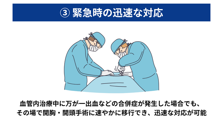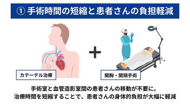 これにより、例えば心臓や脳の血管手術において、開胸・開頭手術と同時にカテーテルを用いた血管内治療を並行して行うことが可能になります。従来別々の場所で行っていた治療を一つの部屋で完結できるため、以下のようなメリットがあります。