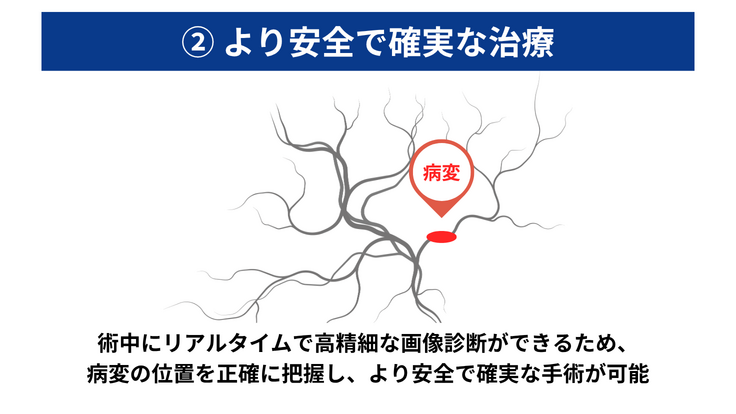 これまでは、開頭術は手術室で、血管内治療は血管撮影室で行なっていましたが、ハイブリッド手術室ができればこれらの手術を同時に施行することができます。ハイブリッド手術室で治療を行うことでそれぞれの治療の利点を生かしたより低侵襲で安全性の高い治療方針を立てることができます。また、ハイブリッド手術室であれば、開頭術で治療を行なった後に血管全体の確認のための血管撮影検査や、CT画像も撮影することができ、脳実質に問題がないかどうかの評価も行うことができます。