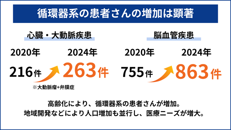 急速な高齢化により、日本全体で医療ニーズはますます多様化・高度化しています。特に、脳卒中や心臓病といった循環器系疾患は、年々患者数が増加傾向にあります。
