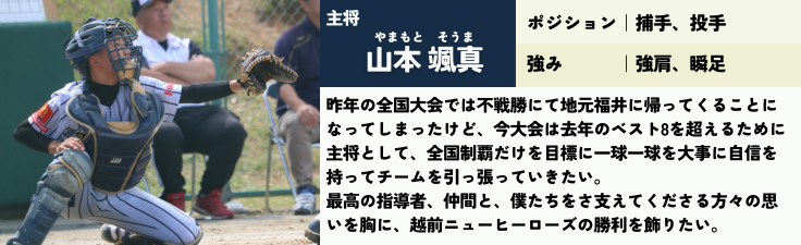 昨年の全国大会では不戦勝にて地元福井に帰ってくることになってしまったけど、今大会は去年のベスト8を超えるために主将として、全国制覇だけを目標に一球一球を大事に自信を持ってチームを引っ張っていきたい。