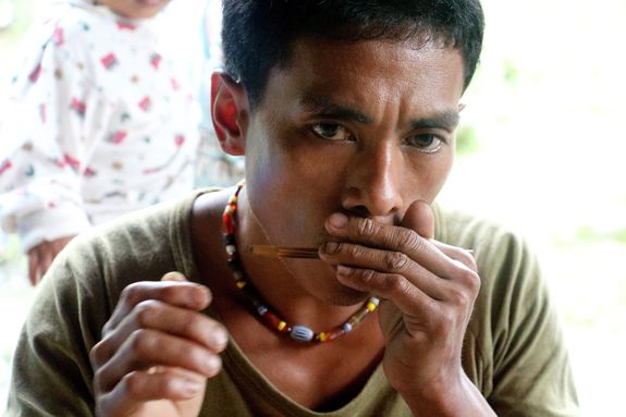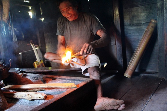 (ダオ村の竹楽器制作の名手。右手奥にはクリトンという楽器が見える。