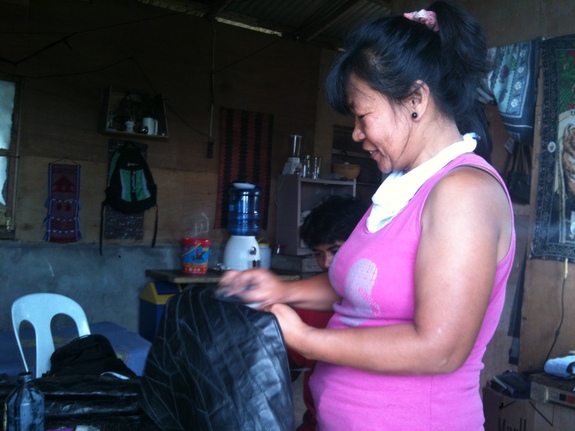 最後の仕上げ、革を磨くママ職人さん。ホームファクトリーです!