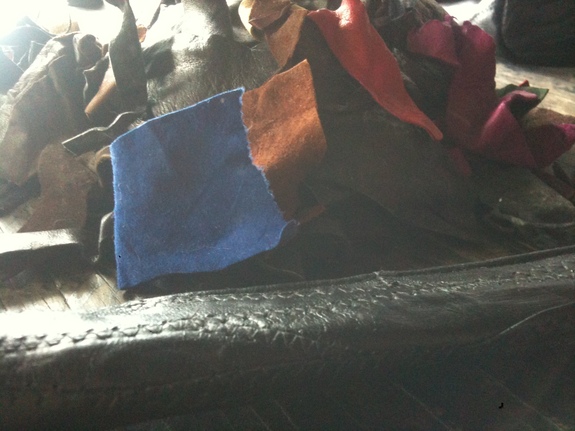奥に見えるのが、材料となっている端切れたち。1つ1つの端切れの形は違うので、毎回少しずつ異なるデザインのものが出来上がります。一つとして同じものはありません!