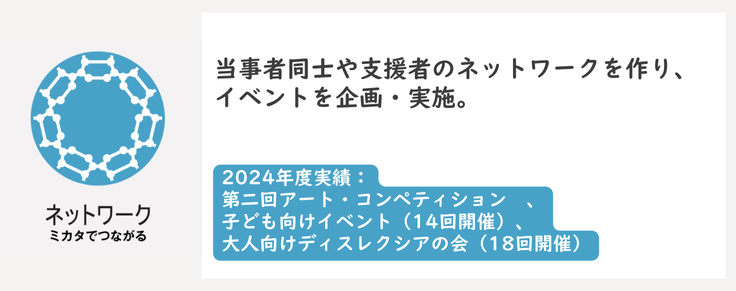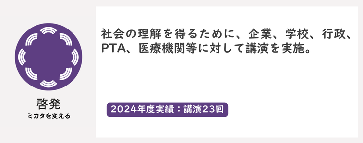 社会のミカタ(見方)を変え、ミカタ(味方)を増やすために 、社会の啓発、本人・保護者のエンパワメント、人材育成、そしてネットワークに力を入れています。