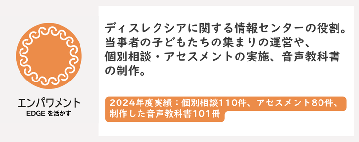 エッジさんは、日本におけるディスレクシア啓発の先駆者として、長年にわたり当事者に寄り添いながら、社会への理解を広げてこられました。その活動から私たちも多くの学びと励ましをいただいています。