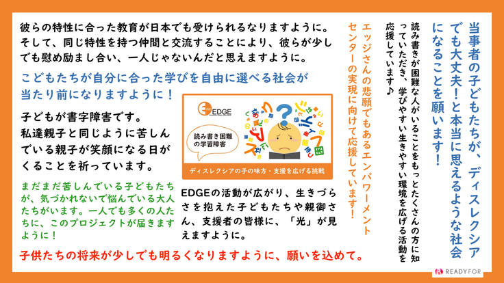 ディスレクシアの啓発・当事者への支援など、活動をがんばってまいります。